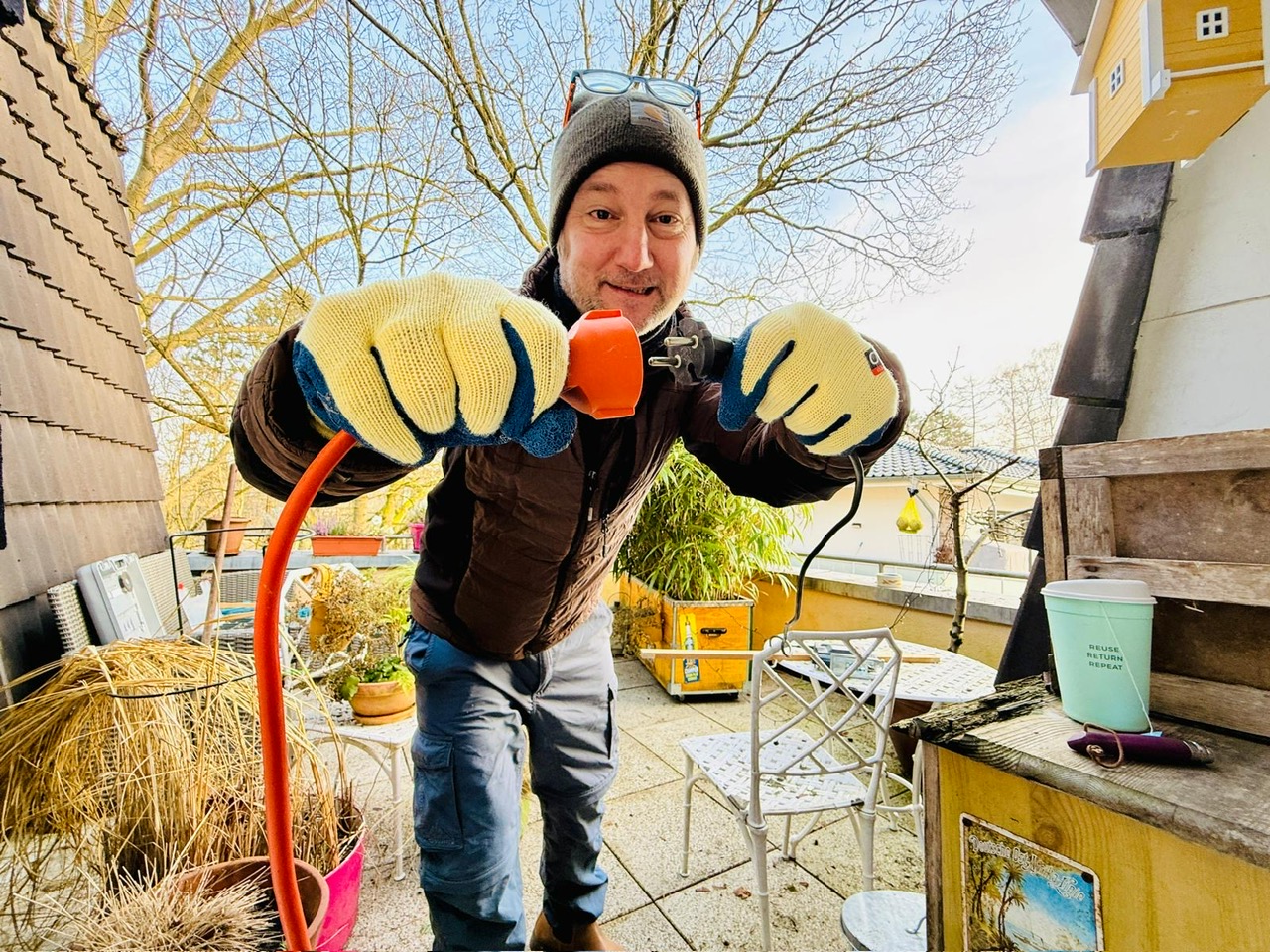 Hatte alles hier, Werkzeug, Holz, selbst noch den einen Rest grüner Lasur. Das mag ich am liebsten, Material wiederverwenden, recyceln, einfach machen, weil man alles da hat. Das ist diese andere Art der Kreativität, die mich wirklich zufrieden macht. Das hat gestern alles in allem immerhin fast 8 Stunden gedauert, bis die Terrasse aussah wie neu. Habe sogar die Fliesen einmal geschrubbt, obwohl ich weiß, dass meine bezaubernde Frau da im Frühling wieder mit heller Freude drüber kärchern wird. Aber bis dahin sind ja noch ein paar Wochen.