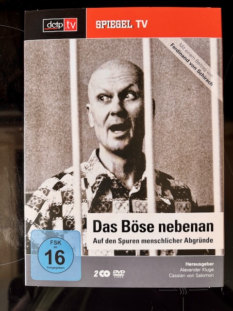 Tatsächlich haben wir für ein Projekt sogar wirklich mal zusammengearbeitet: eine DVD über das Böse. Kluge hatte über die Jahre viele Interviews und Filmchen zu dem Thema produziert, und er wollte sie herausgeben, aber er brauchte dafür noch was „Normales“. Oder was Normaleres. Meine Frau und ich hatten kurz zuvor bei SPIEGEL TV – auch in einem der dctp-Fenster – eine lange Doku für VOX produziert, „Das Böse nebenan“, eine für damalige Verhältnisse (2009) ziemlich neuartige Form der Erzählung und Gestaltung, mit sehr tiefgehenden Experten-Interviews, ein Film, der unter die Haut ging. Man muss sich vorstellen, True Crime war damals fast eine Nische, und Amrei und ich versuchten, die Grenzen auszuloten. Und SPIEGEL TV ließ uns machen, das muss man auch mal sagen. Da wurde nicht auf die Schnitt-Tage geguckt, weil alle ahnten, das könnte auch nach vorne losgehen. So war es auf der einen Seite nicht völlig überraschend, aber doch ein großes Kompliment, dass sich Kluge bei uns meldete und sagte, er brauche unseren Film, gewissermaßen als (massenkompatiblen) Hauptfilm für seine kleinen (wunderbaren) Miniaturen, um die DVD herauszubringen.