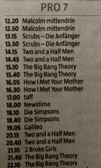 Kurze Kaffeepause, einen Blick in die taz, Kulturteil, TOMs Comic, den ich liebe, und das Fernsehprogramm … das fällt einem ja nie so auf, naja, mir jedenfalls nicht, aber wenn man das mal so ganz nüchtern, schwarz auf weiß liest, mit wie wenig Formaten Pro 7 am Tag auskommt, das ist schon bemerkenswert. Also, nicht falsch verstehen, ich habe eben auch Two an a Half Men geguckt, aber eigentlich müsste man im Sinne der Vielfalt eine Mindestzahl an verschiedenen Formaten täglich vorschreiben. Oder nicht?