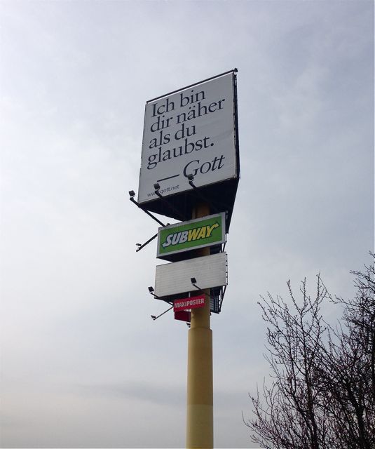 Wer spricht? Gott selbst? Kann er keine Kommaregeln – aber das Riesenplakat als Werbungskosten absetzen? Und wird Gott präsentiert von Subway? Rechts daneben die romantischere Variante des Wahnsinns. Ja, und da kann man sagen, ob Ochsenkarre oder Trecker, alles menschlich, aber ist der technische Stand heute wirklich noch menschlich? Ein Trecker wie ein Panzer – wo ist das verfluchte Ende des Faustkeils?