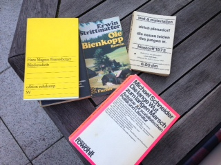 In Altona hat jemand an der Bushaltestelle eine Kiste mit Büchern hingestellt: zu verschenken. Hab zum Glück reingeguckt und zugeschlagen. Enzensberger, Strittmater, eine Kompilation mit Texten sozialistischer Politk und Literatur – und schließlich eine total coole (Schul-?)Ausgabe von Plenzdorfs „Die neuen Leiden des jungen W.“ Keine Ahnung, ob da jemand Abschied vom Linkssein gefeiert hat, ich bin jedenfalls ganz beseelt über den unverhofften Reichtum. Hab gleich angefangen, in dem Strittmater zu lesen, „Ole Bienkopp“, gehört (laut Fischer-Klappentext) zu den bedeutendsten Werken der DDR-Literatur und gilt als Muster des `sozialistischen Dorfromans´.