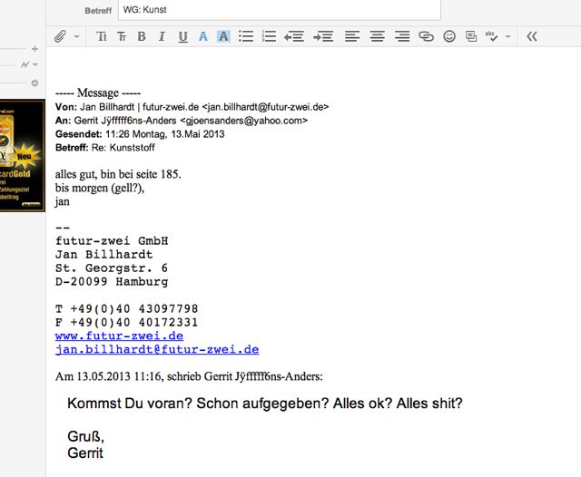 Aber es gibt auch Positives zu vermelden. Hatte heute Morgen eine kleine Korrespondenz mit meinem Verleger: